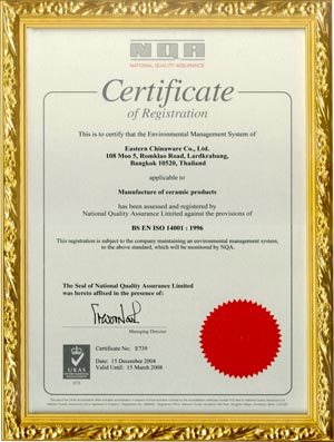 We have obtained the modern technologies from Europe and Japan, to maintain the internation standard of quality. Our products are achieved the international standard of FDA (US. Food and Drug Adminisration) and PROP 65. We have ensured that our Eastern Chinware products are microwave, dishwasher safe and guaranteed against glaze crazing in normal everyday use.We are improved our high quality in order to end user have gained the best products.We however, are not forget to maintain the environement to share the best pollusion back to human lives and socail. We would like to commit that we are continueously enthusiasm to crate the high quality and best stoneware dinnerware products for all of the worldwide customers. Eastern Chinaware has also achieved the honor award of ISO 14001 certification since 15 December, 2004 by the approval company of Nation Quauty Assurance. |